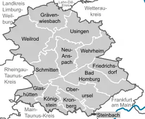 The Hochtaunuskreis is a Kreis (district) in the middle of Hesse, Germany and is part of the Frankfurt/Rhine-Main Metropolitan Region. Neighbouring districts are Lahn-Dill, Wetteraukreis, district-free Frankfurt, Main-Taunus, Rheingau-Taunus, Limburg-Weilburg.