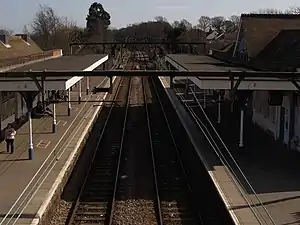 The line from Wickford to Southend and Hockley station were opened on 1 October 1889.[2] There was a signal box on the down platform, this was decommissioned in 1938 with the introduction of colour light signalling on the line between Wickford and Southend.[3] There was a goods yard on the 'up' side to the west of the station, a 30 cwt crane was subsequently installed. Freight traffic ceased on 5 June 1967.[2] Electrification of the Shenfield to Southend Victoria line using 1.5 kV DC overhead line electrification (OLE) was completed on 31 December 1956. This was changed to 6.25 kV AC in November 1960 and to 25 kV AC in January 1979.[2]