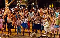 Due to digital sales, the song debuted at number sixty-eight in the Billboard Hot 100 for the week ending March 21, 2009.[21] The song then found new peaks at number forty-six and twenty-eight on the chart, respectively.[22] For the week ending May 2, 2009, "Hoedown Throwdown" peaked at number eighteen on the Billboard Hot 100 due to digital downloads that placed it at number eight on Hot Digital Songs.[23] The song also peaked at number twenty-nine in the canceled Pop 100 chart.[24] As of July 2013, it has sold 1,300,000 copies in the United States.[25] In Canada, the song peaked at number fifteen.[21][23] In the Australian Singles Chart, the song debuted at number forty and peaked at number twenty after three weeks of finding new peaks.[26] "Hoedown Throwdown" was certified gold by the Australian Recording Industry Association (ARIA) for the sales of over 35,000 digital downloads.[27] "Hoedown Throwdown" debuted and peaked at number forty in the New Zealand Singles Chart.[28]