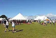 Wildfoods has traditionally been run on the second Saturday in March, the driest time on the West Coast.[1][5] The weather has generally been fine, but in the third festival in 1992 a squall blew down the festival tent.[3] By that year visitor numbers had increased to 3,800, so in 1993 Wildfoods moved to its current venue of Cass Square, which has a capacity of 10,000.[3][6][7] In 1994 for the first time the festival was opened by the West Coast Member of Parliament, Damien O'Connor, rather than the Mayor of Westland. One councillor decried the involvement of a "foreigner" as "propaganda by the Labour Party".[8]