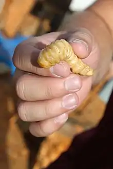 - Huhu grubs, the larvae of the large New Zealand beetle Prionoplus reticularis, retrieved from rotten logs that are chopped up on site. Sometimes served live to daring or intoxicated attendees,[6] but usually cooked on a barbecue, these are described as "nutty and meaty" in flavour.[31]