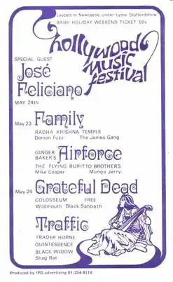 The Hollywood Music Festival was held at Leycett in an area called Hollywood on the grounds of Ted Askey's[1] Lower (pig) Farm at Finney Green,[2] between Silverdale and Leycett,[3] near Newcastle-under-Lyme, Staffordshire, England, on 23 and 24 May 1970. It was notable for the first performance of Grateful Dead in the UK and also for the performance of Jose Feliciano and Mungo Jerry, and featured such notable bands as Free, Ginger Baker's Air Force, Colosseum, Family, Black Sabbath and Traffic. The company responsible for the festival was Onista Ltd, who promptly went bankrupt unable to pay festival staff. Onista was an offshoot of Eliot Cohen's Red Bus company, with Ellis Elias and Elliot Cohen as the promoters.