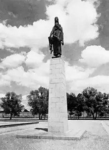 The realized landscape features smaller burial mounds where mass graves exist. Each mound features a stone plaque noting how many thousands of people are buried within. A path links these graves with a commemorative obelisk and a freestanding, inscribed wall at one end of the site. Critics, such as Joachim Wolschke-Bulmahn, claim that the design still engenders a subordination of the commemoration to the landscape itself, therefore playing into the national socialist ideals which caused the Holocaust.[4]