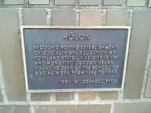 Donald Wilson's Holon was originally commissioned in 1978–1979 and dedicated to the late Dr. Gordon Hearn, the first dean of Portland State University's School of Social Work.[1][2] Its name comes from the Greek holos, which means "whole, entire, complete in all its parts – something that has integrity and identity at the same time as it is a part of a larger system".[2][3] The sculpture was carved from white Indiana Limestone. It measured approximately 60 inches (1.5 m) x 33 inches (0.84 m) x 12 inches (0.30 m) and rested on a brick base that measured around 30 inches (0.76 m) x 24 inches (0.61 m) x 19.25 inches (0.489 m).[2] When the Smithsonian Institution surveyed the sculpture for its "Save Outdoor Sculpture!" program in April 1993, the organization categorized the piece as abstract, its condition as "treatment needed", and noted that Wilson had removed graffiti previously.[2]