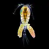 Copepods are small holoplanktonic crustaceans that swim using their hind legs and antennae.[3]