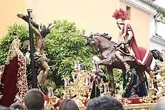 There are up to three pasos in each procession. The pasos dedicated to Jesus use figures of wood, wax, and wire to depict scenes from the Passion, and are usually covered in gold. The pasos dedicated to the Virgin Mary are usually covered in silver, and depict Mary weeping for her Son and sometimes holding Him in her arms.[1]