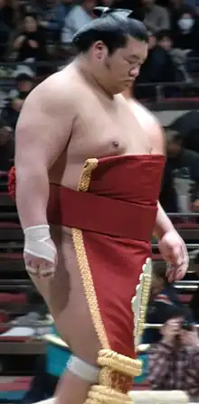 Miura Yoshiyuki started practicing sumo in his third year of primary school. This was the same primary school as the well-known sumo wrestler Mainoumi had attended several years before. Miura has stated his reason for wanting to practice sumo was that he wanted to be strong so he could protect a girl he liked at the time.[1] In his third year of middle school (where Mainoumi also attended) he came in second overall in a national junior high school sumo competition. At this time, he was introduced to former yokozuna Asahifuji, who was scouting for prospective wrestlers for his Isegahama stable, through an intermediary. Miura decided at this point that if he were to become a professional sumo wrestler he would join this stable.[1] Miura would continue to practice sumo through high school and as a student at Kinki University, participating in several national competitions.