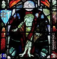 The upper panel of Joseph's window shows the saint wearing a crown of fire, and standing beside the Holy Family and four angels. In the main panel, he wears a gold and red cloak, and is given a blue and green halo.[108] Clarke's depiction of Joseph is based on a 14th-century representation of the prophet Zephaniah now in the Victoria and Albert Museum, London.[126] In contrast to contemporary Catholic representations of Joseph which depict him as a healthy and strong middle-aged man, Clarke shows him in the medieval tradition, as an old and frail man.[127] The lower panel illustrates Joseph's death, with Mary, Jesus, Finbarr, Columcille and a number of other saints kneeling in prayer at his deathbed.[128]