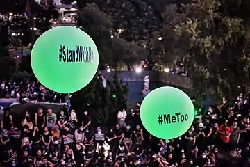 During the rally, several protestors have stood up and spoken about their experiences with sexual violence performed by the police, some broke down in tears many times while giving speeches. Most of them have mentioned strip-searching, one mentioned being verbally abused by a male officer for calling her a prostitute.[119] One of the female protestors has claimed that she has been forcefully fed with diuretics, then her genital was being rubbed with hard objects by the police, which has led to the result of urinary incontinence.[120] "Some officers use a forcefully grab male protesters by the crotch", two students from the rally stated that the actions of police's sexual misconduct were towards all genders, "This is a combination of both men and women. Anyone who is taken in by the police shouldn't be sexually abused"[121]