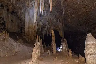 The Hoq Cave or Hawk Cave (Arabic: كهف هوق) is a limestone cave on the island of Socotra, Yemen. It is located in the Hala spot approximately 1.5 km from the north-eastern coast facing the open sea to north-east. Clearly visible from the sea, but of difficult access, it is situated in an altitude of 350 m. The about 2 km deep cave has a main passage with a mean width of 50 m and a mean height of 20 m. 200 m from the entrance is the limite d’éclairement. The temperature is constant during the year and varies between 25 and 27 °C with a humidity higher than 95%.[1]