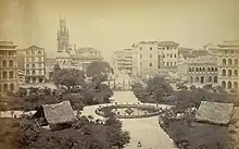 The building was begun in 1821 and not completed for twelve years. In 1842, the area had been just a dump of coconut shells and debris. The Police Commissioner, Charles Forjett, thought of converting the Green into a circle surrounded by buildings. He was supported by governors Lord Elphinstone and Sir Bartle Frère. The garden was planned in 1869 and completed in 1872 with well laid out walkways and trees planted all around.[1] An ornamental fountain was placed in the centre, but it was replaced by a modern art deco iron pipes design.