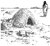 Horno (/ˈɔːrnoʊ/ OR-noh; Spanish: [ˈoɾno]) is a mud adobe-built outdoor oven used by the Native Americans and the early settlers of North America.[1] Originally introduced to the Iberian Peninsula by the Moors, it was quickly adopted and carried to all Spanish-occupied lands.[2] The horno has a beehive shape and uses wood as the heat source.[3] The procedure, still used in parts of New Mexico and Arizona, is to build a fire inside the horno and, when the proper amount of time has passed, remove the embers and ashes and insert the bread to be cooked. In the case of corn, the embers are doused with water and the corn is then inserted into the horno to be steam-cooked. When cooking meats, the oven is fired to a "white hot" temperature (approximately 650 °F or 343 °C), the coals are moved to the back of the oven, and the meats are placed inside. The smoke hole and door are sealed with mud. A twenty-one-pound turkey takes 21⁄2 to 3 hours to be cooked.[3]