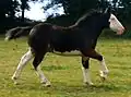 Foal growth leads to particularly rapid weight gain in the first few months. At birth, foals weigh 8 to 12 % of their mother's live weight. They double their birth weight during their first month of life. By the time they reach weaning age, at around 6 or 7 months, their weight has quintupled. By the age of one, they have reached around 65 % of their adult weight and 90 % of their adult height, which explains the often gangly appearance of foals at this age.[10] Draft foals fattened for slaughter weigh on average 59.3 % of the adult horse's live weight at 8 months, then 70.1 % at 12 months, and 90.1 % at 30 months.[2]