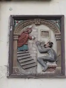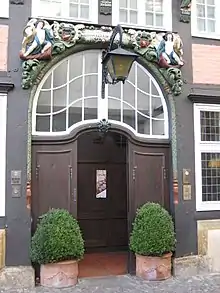 In 1690, bailiff Gerdt Heindrich Meuschen built a three-storey, gable-ended half-timbered house on Bierstraße. The gables along the ridged roof protrude in a similar manner to the second floor. Meuschen had a medallion added above the entrance portal; alongside this are the familial emblems of the building’s constructor and his wife Susanne Gertraud (née von Lengerken). The half-timbered consoles are furnished with carved figures of the evangelists Matthew, Mark, Luke and John as well as Jesus. The rear side of the building was originally built as a Steinwerk (stone work).
