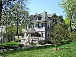 White Avenue is located northeast of downtown Wakefield, and is a short street in a residential area just east of Lake Quannapowitt. This house stands on the north side of the street, facing south on a lot that slopes west toward the lake. It is a 2+1⁄2-story wood-frame structure, with a hip roof, with two gable-roof and clapboarded exterior. Its roof has dormers bracketing an oriel window in front, and a normal gabled dormer to the side; these gables are decorated with jigsawn Queen Anne woodwork. The house is three bays wide, with a center entrance sheltered by a porch supported by paired columns, with jigsawn valances. The porch extends to an open veranda to either side.[2]