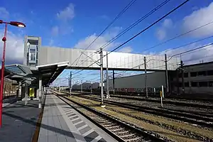 The new station partially opened on December 10, 2017 (one platform and an access footbridge), while a provisional stop of the same name on line 4 was officially closed.[1][6] The second platform was originally planned to be completed by 2020, at the same time as the arrival of the tramway to the south of the capital, with the opening of the second platform and the mixed tramway and bus bridge that will overlook it.[5] However, the opening of the second platform, along with other projects on the line, was pushed back to 2026 due to problems with the acquisition of the right-of-way, revisions to the design of a railway structure due to a nearby motorway, and shortages in construction supplies due to the COVID-19 pandemic.[7] Phase 1 ultimately cost €42.9 million, and provides direct access to the southern districts of Luxembourg City, home to a major business park, the Cloche-d'Or and the new Ban de Gasperich district.[6] The new station saves a considerable amount of time for workers coming from the south of the country and the border regions, as they don't have to go all the way up to the central station and then take the municipal buses, and thus retrace their steps.[6]
