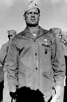He joined the United States Marine Corps in 1942 and became an officer. In addition to seeing combat with the 4th Marine Division, he played for a service football team in Maui, Hawaii.[2] He served with I Company, 3rd Battalion, 23rd Marines through the battles of Kwajalein, Saipan (earning a Silver Star), and Tinian.[3] On February 19, 1945, 1st Lieutenant Johnson was killed in action by a mortar shell at the Battle of Iwo Jima and awarded a second Silver Star posthumously; he was one of three former NFL players to die on Iwo Jima along with Jack Chevigny and Jack Lummus. Johnson was buried at the National Memorial Cemetery of the Pacific in Honolulu on February 2, 1949.[2]
