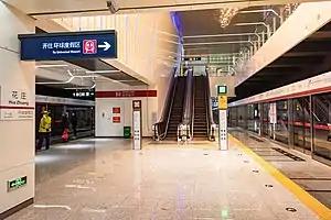 Huazhuang station[2] (Chinese: 花庄站; pinyin: Huāzhuāng zhàn) is a subway station on Line 7 and the Batong line (through operation to Line 1) of the Beijing Subway. It is located in Huazhuang Village in Liyuan Town in Tongzhou District.[1] It has a double-island platform. It is operated by Beijing Mass Transit Railway Operation Corporation Limited. The station was the eastern terminus for both lines until Universal Resort station opened on August 26, 2021.