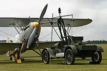 One original Hucks starter, built during 1920 by de Havilland, is known to survive at the Shuttleworth Collection in Bedfordshire; during the 2010s, it became the first Hucks Starter to actually start an aircraft in 70 years when it successfully started a preserved Hawker Hind.[1][8] The Shuttleworth's unit has since been regularly used to start the vintage aircraft based there, while a number of working reproductions have also been built, based on original Ford Model T chassis.[1] The RAF Museum London has a restored example, comprised both of original pieces from multiple vehicles and new-build bodywork, on permanent display.[3]