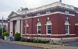• U.S. Post Office: This 1911 brick building at 402 Union Street is one of twelve in New York designed by James Knox Taylor, supervising architect for the Treasury Department in the early 20th century. He had begun to introduce classical ornamentation to the brick Colonial Revival style preferred for post offices, and designed for Hudson two Roman-inspired porticoes similar to those on the county courthouse across the square.[7] In 1988 it was one of the many New York post offices listed on the Register from a statewide Multiple Property Submission.