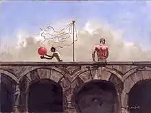 Mr. Lee-Smith's paintings usually have spare settings suggestive of theater stages or bleak urban or seaside landscapes. Walls stretch out under gray skies. Men and women, as lithe as dancers, seem frozen in place. Most are dressed in street clothes; some wear exotic masks. Children frequently appear, as do props reminiscent of circuses. The work has an air of mystery associated with the paintings of Giorgio de Chirico and Edward Hopper.[3]