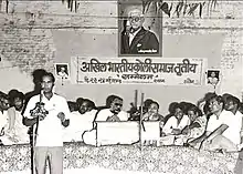 President Ram Nath Kovind (as young man) speaching in 3rd meeting of Koli society in Ujjain and Hukam Chand Kachwai seating on stage in centre (left of table).jpg