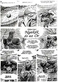 Ernő Zórád ended his professional relationship with Tibor Cs. Horváth and wrote his own comic scripts.[49] Luckily Zórád was not just a great artist, but also a talented storyteller: these comics came much closer to the medium's own language.[49] He also made experimental collage comics in the early seventies attracting international attention. These works were invited to the Salone Internazionale del Comics festival in 1970 but his portfolio – due to Hungarian bureaucracy – has arrived late. Furthermore, the works has been stolen from the festival.[37][50] By the late seventies the classic trio of Hungarian comics creators disappeared: Korcsmáros died in 1975, Sebők died in 1980 and Zórád retired temporarily. Since young talents were not introduced during the preceding three decades (except for Attila Fazekas), many mark these years the end of Hungarian comics' golden age.[37]