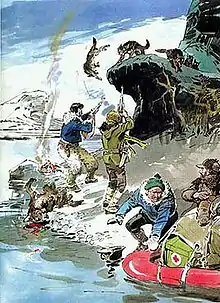 - Imre Sebők [69] (Apostag, 6 August 1906 – Budapest, 14 September 1980)[70] painter, cartoonist, graphic artist. After art schooling at Jenő Feics and Tibor Pólya, Sebők studied at the Academy of Fine Arts under the instruction of Oszkár Glatz and Aurél Bernáth, but left school after two years for financial reasons. Besides being a regular illustrator at Tolnai világlapja (Tolnai's world magazine), his illustrations were frequent at Délibáb (Mirage), Ünnep (Holiday), Párizsi Divat (Parisian Fashion), Magyar Cserkész (Hungarian Boyscout). His first "subtitled" pictorial stories were published in Gyermekvilág (Child World) in 1942. His painted covers and illustrations for magazines and pulp novels made him widely known, earning an invitation to draw Tarzan comics in Canada, but he did not accept the offer.[70] Besides Pál Korcsmáros, after 1945 he became one of Pesti Izé (Pest Whatchamacallit)'s star illustrator, with slightly erotic images. His comics (usually adaptations written by Tibor Cs. Horváth) were mostly published in Magyar Ifjúság (Hungarian Youth) (after 1958), Népszava (People's Voice) (after 1962). After 1966, exhausted by the daily strips for Népszava, his art became less detailed, sketchy. The daily rush being already behind him made it possible for the artist to reach his second peak from 1973 till his death in 1980.[71] His style is closest to Alex Raymond and Burne Hogarth with the difference that he never made a compromise in favor for better understanding and vendibility.[72] A master of anatomy, his characters' movement are perfect, the static view points are counterpointed by dramatic lighting compositions and emphasized expressive hand gestures.[72][73]
