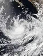 Blas strengthened slightly on June 17, with its maximum sustained winds increasing to near 90 mph (140 km/h) and a minimum central barometric pressure of 976 mbar (28.82 inHg).[13] Soon after, the cyclone began to weaken as it moved westward.[14] At 03:00 UTC on June 18, Blas weakened to a tropical storm due to the mid-level center being sheared off to the southwestern side of the storm combined with colder sea surface temperatures as it moved north-west, with no deep convection near the surface center.[15] The storm continued to weaken that day, with satellite images showing a partially exposed low-level center with convection confined to the southeastern quadrant of its circulation.[16][17]