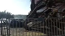 Structural damage ranged from the superficial to complete wall or roof failure, the latter being relatively uncommon.[56] A multitude of buildings, including churches, a visitor's center, the House of Assembly building in Hamilton, and the Bermuda Police Service headquarters at Prospect Camp, suffered some degree of roof damage.[70][71][72] Older structures were particularly prone to substantial damage,[2] as were commercial storage buildings subject to less strict building codes.[73] In December, five new slate quarries were approved to accommodate the demand for roofing materials.[74] Both the new and the old portions of King Edward VII Memorial Hospital received significant damage that exposed the facilities to the elements.[75] An exhibit at the Bermuda Aquarium, Museum and Zoo was unroofed, and coastal erosion threatened to encroach on the site, though no animals were harmed.[76] Part of the structure's roof was blown a one-quarter mile (400 m).[77]
