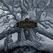 The album artwork was illustrated by Paul Romano, who has illustrated all covers for previous Mastodon releases except The Hunter and Once More 'Round the Sun. The cover features the title plaque before a dormant tree resembling a torso and outstretched arms, rendered in blacks and greys. The face of Nick John, the bands longtime manager, appears within the tree, peering above an Dharmachakra or 8-spoked wheel. The band attributes John's passing in 2018 as the thematic lyrical inspiration for the album.[8] Also pictured are a stag, a rabbit with a crow mask, a spider, and several hyenas, one of which faces the viewer sporting a Thalia and Melpomene-like saddle on its back, giving an appearance of Cerberus. The cover artwork is the central of five main square panels which combine to form a cross containing the tree, its branches, and roots. Four additional panels form the corners with ancillary themes. The tree is surmounted in the top panel by a hawk with an open exposed heart and rose wreath. Scales seen below the tree on the cover panel develop to a python descending into a cavern containing lascivious scenes supervised by a bull-horned, winged being in the bottom panel. The left branch shows wintering wolves set before Byzantine architecture; at right, The Hanged Man hangs from the branch aside the Emperor of Sand beneath a Spring storm.