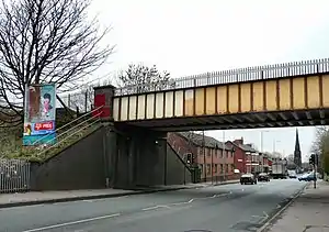 ![]() The railway bridge next to the site of the former Hyde Road station | |