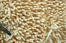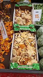 Hydnum repandum is frequently sold with chanterelles in Italy, and in France, it is one of the officially recognized edible species sold in markets.[37] In Europe, it is usually sold under its French name pied-de-mouton (sheep's foot).[33] It is also collected and sold in local markets of Mexico,[45] Spain[46] and British Columbia, Canada.[47] H. repandum mushrooms are also used as a food source by the red squirrel (Sciurus vulgaris).[48]