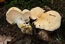 The orange-, yellow- or tan-colored pileus (cap) is up to 17 cm (6+1⁄2 in) wide, although specimens measuring 25 cm (10 in) have been documented. It is generally somewhat irregular in shape (it may be convex or concave at maturity), with a wavy margin that is rolled inward when young.[29] Caps grow in a distorted shape when fruit bodies are closely clustered.[30] The cap surface is generally dry and smooth, although mature specimens may show cracking.[29] Viewed from above, the caps of mature specimens resemble somewhat those of chanterelles.[31] The flesh is thick, white, firm, brittle, and bruises yellow to orange-brown. The underside is densely covered with small, slender whitish spines measuring 2–7 mm (3⁄32–9⁄32 in) long.[29] These spines sometimes run down at least one side of the stipe.[27] The stipe, typically 3–10 cm (1–4 in) long and 1–3 cm (1⁄2–1+1⁄4 in) thick, is either white or the same color as the cap, and is sometimes off-center.[29] It is easy to overlook the mushrooms when they are situated amongst gilled mushrooms and boletes, because the cap and stipe are fairly nondescript and the mushrooms must be turned over to reveal their spines.[32] The pure white variety of this species, H. repandum var. album, is smaller than the main variety, with a cap measuring 2–7 cm (1–3 in) wide and a stipe that is 1–3 cm (1⁄2–1+1⁄4 in) long.[24]