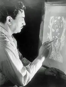 In 1939, Velonis, Warsager and other artists co-founded the Creative Printmakers Group in New York City.[21][22] About this group, Sylvie Covey wrote in Modern Printmaking: A Guide to Traditional and Digital Techniques: "The group's shared screen-printing studio introduced the silkscreen process to many serious artists who went there to have editions printed. Vincent Longo worked as a colorist at Creative Printmakers Group, as did Jackson Pollock, and the print shop eventually became the most important silkscreen shop of the era. It was at about this time that the word serigraphy, which combines the Latin word seri ("silk") and the Greek word grapho ("to write"), first appeared. It was coined by Carl Zigrosser . . . . to distinguish fine-art from commercial silkscreen"".[19]