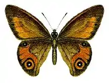 The wingspan is about 30 mm. Adults are brown with an orange patch on each wing and an eyespot on each hindwing. The underside of the wings is brown with two eyespots on each hindwing.