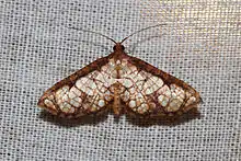 The wingspan is 15–19 mm. A small species with a very striking reticulate (net-like), dark brown patterning. Some specimens differ in the size of various fenestrae although the overall distribution of these fenestrae is similar.