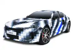 As shown, the Vision FK is similar externally to the Kia Stinger, albeit with significant interior changes to accommodate the hybrid drivetrain and electric traction motors.[6] The Vision FK is a two-door coupe, unlike the Stinger, which is sold as a five-door liftback. In the video, the Vision FK was finished in a primarily black-and-white pixelated vinyl wrap with diagonal blue pixel accents on each side.[3]