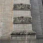 The facade of the powerhouse is self-supporting and independent of the interior.[24] The base of the powerhouse is clad with Milford granite along its northern, southern, and eastern elevations. The upper stories are clad with brick and terracotta and are divided vertically into bays.[25] On the second and third stories of each bay (except for the outermost bays on each side), there are double-height round-arched window openings topped by decorative archivolts and scrolled keystones. These arched window openings largely contain latticed window frames. In the outermost bays, there are two rectangular windows on either of the second and third stories. There are ornamented horizontal friezes running above the first and third stories and a course above the fourth story. The facade was capped by a cornice, which was later removed.[26][27] The overall design of the facade is based on the Boston Public Library, but with over-scaled design elements.[27]