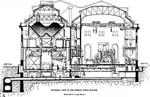 John van Vleck designed the boiler plant of the power house according to a unit plan that divided the plant into six independent functional sections, allowing for high operational flexibility.[42] Each unit contained two rows of six boilers, feeding two steam engines in the generating room. For each unit there were also two condensers, two boiler-feed pumps, two smoke-flue systems with economizers, and two complements of auxiliary apparatus. The twelve boilers were symmetrically arranged around one of the six chimneys.[43] Five of the boiler/engine units were identical; the sixth had a steam turbine plant, installed to power the generator for lighting the subway tunnels.[44] City mains provided the boiler feedwater.[45] The arrangement of the boilers on a single level, and placement of the economizers above the boilers, saved space. The layout permitted a higher, well-lit boiler room, which helped reduce temperature extremes and the risks caused by escaping steam.[17][46] The boiler room ceiling was 35 feet (11 m) high, providing space for ventilation.[47][48]