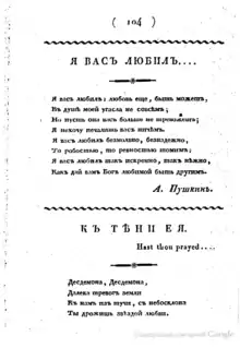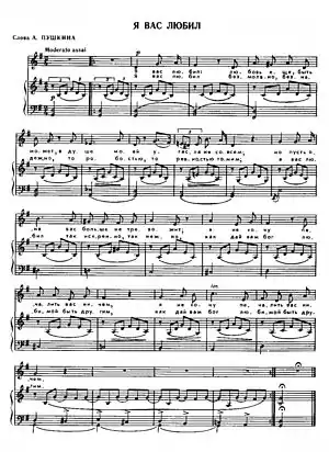 "I Loved You" (Russian: Я вас любил - Ya vas lyubíl) is a poem by Alexander Pushkin written in 1829 and published in 1830. It has been described as "the quintessential statement of the theme of lost love" in Russian poetry,[1] and an example of Pushkin's respectful attitude towards women.[2]