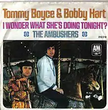 "I Wonder What She's Doing Tonight" is a song written and originally recorded by Tommy Boyce and Bobby Hart (not to be confused with the Barry & the Tamerlanes song of the same title released in 1963). The Boyce and Hart composition was arranged by Artie Butler. Entering the Billboard Hot 100 at #87 just before Christmas 1967, it became a true hit in 1968, reaching #7 on the Cash Box chart and #8 on the Billboard Hot 100 chart.[1] Marvin Stamm performs the trumpet solo and the recording notably features the voice of Tommy Boyce saying "Aww, come on now," in the second verse and "All right, Bobby, let's go," to Bobby Hart just before the third verse.