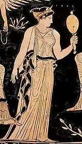 Detail of Iaso, the goddess of healing, from a scene depicting a group of goddesses. Iaso gazes at herself in a mirror, presumably as a sign of good health.