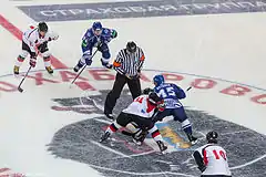 ![]() Exhibition game Amur Khabarovsk vs. Japanese national team on August 23, 2012. Face-off at the beginning of the game. Amur forwards Juha-Pekka Hytönen (at right) and Jakub Petružálek. | |