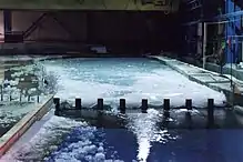 An ice blockage on a river is usually called an ice jam, but sometimes an ice dam.[2] An ice jam is an obstruction on a river formed by blocks of ice. Defined by the International Association of Hydraulic Research (IAHR) Working Group on River Ice Hydraulics an ice jam is a "stationary accumulation of fragmented ice or frazil that restricts flow" on a river or stream. The jam may effectively create a dam with an accumulation of anchor ice on the bottom of the river.[3] On rivers the obstruction may be a change of width, structure, bend or decrease in gradient.[4]