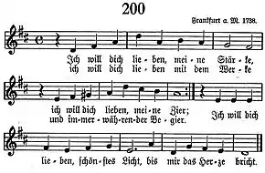 The text was also sung with other melodies, such as a tune published in the hymnal Harmonischer Liederschatz (Harmonic treasure of songs) in 1738 by Johann Balthasar König, a melody that was preferred in Protestant hymnals.[2][5]
