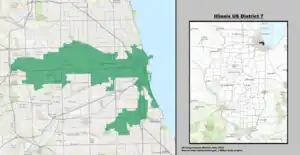 The 7th congressional district of Illinois covers parts of Cook County, as of the 2023 redistricting that followed the 2020 census. All or parts of Broadview, Bellwood, Chicago, Forest Park, Hillside, Oak Park, La Grange Park, Maywood, and Westchester are included. Democrat Danny K. Davis has represented the district since January 1997. With a Cook Partisan Voting Index rating of D+36, it is the most Democratic district in Illinois.[2]