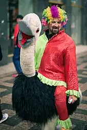 An illusion costume is a costume that fools the eyes by making it seem that the person in the costume is riding an animal, being held by another person (which is part of the costume), or many other things. The most common is the rider, in which the "rider" (person) gives the illusion of riding an animal; the person's legs go through the hollowed-out animal legs, along with fake legs dangling off the wearer's body to finish off the illusion.
