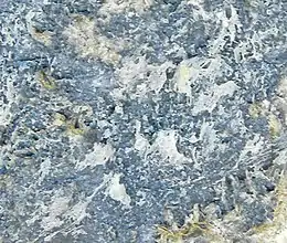Ilsemannite forms by the oxidation of molybdenum-bearing minerals, making it a secondary mineral. It is associated with gypsum, wulfenite, melanterite, halotrichite, molybdite, molybdenite, jordisite, and other oxidized uranium minerals;[2] however, it had been found in association with cinnabar as well in 1939. In the aforementioned encounter, ilsemannite was found as veinlets and as irregular lenses or pods in association of the cinnabar specimens. These specimens were described to often stain the nearby calcites a light blue color. It has a type locality of Carinthia, and although it is an uncommon mineral, it has been described in more than a dozen of other localities since then. Despite this fact, there is still an uncertainty lingering around the chemical composition and the origin of the mineral.[3]