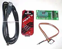- USB cable - Small and light weight, has support for voltage source and most computers have extra ports available. The distance between the circuit to be programmed and the computer is limited by the length of USB cable - it must usually be less than 180 cm. This can make programming devices deep in machinery or cabinets a problem.